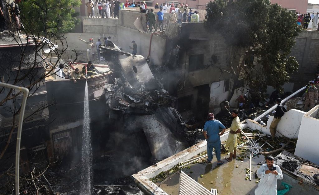 ڪراچي ايئرپورٽ جي ويجهو رهائشي علائقي ۾ ڪري تباهه ٿي ويو جنهن ۾ 97 فوت ۽ ٻه ڄاڻا بچي ويا جيتوڻيڪ هن وقت تائين 19 فوتگين جي سڄاڻپ ٿي سگهي آهي